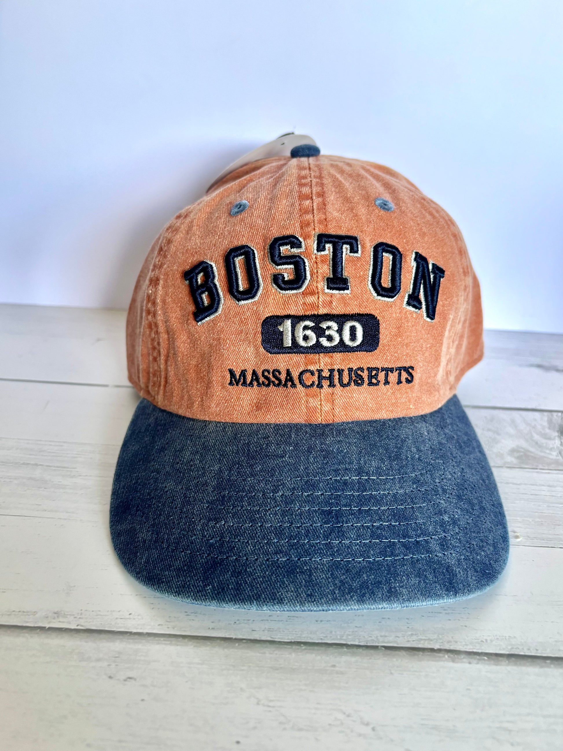 100% cotton BOSTON hat. The word "BOSTON" is in large, 1 inch embossed raised letters. Below BOSTON is the year 1630, when Boston was settled. MASSACHUSETTS is just below 1630. Cap has pre-curved bill, cloth strap and an antique brass slide buckle closure with tuck-in grommet, so it fits well on anyone.